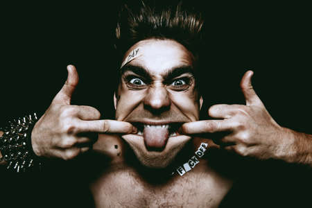 Bad boy concept. A portrait of a bad guy demonstrating antisocial behavior, rudeness and aggression. Rocker, punk.