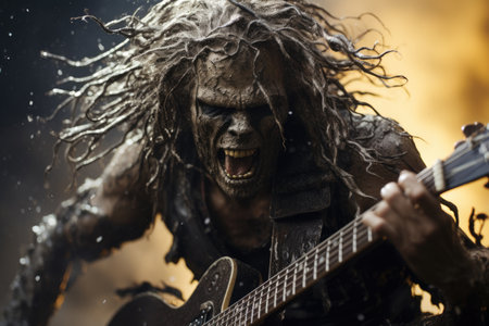Dead musician playing on guitar, Halloween horror concept, metal music