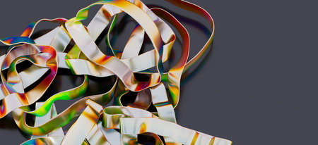 A close-up of glossy, reflective metal shapes and curves in an abstract composition on a white background. The metallic sheen is captured with iridescent, holographic, chromatic colors that create a sense of depth and dimensionality within the frame. This high-definition image showcases intricate details and textures to emphasize its shiny surface and rainbow-like reflections. It's a visually stunning representation of modern design elements in the style of abstract expressionism. --ar 29:15 --v 6.1 Job ID: 6720b107-1e1e-4cc0-a89a-a620e9d080e6