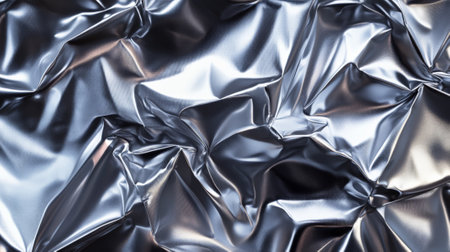 A glossy silver crumpled plastic poster with random folds and subtle creases. The surface reflects light unevenly, creating a futuristic, sleek background.