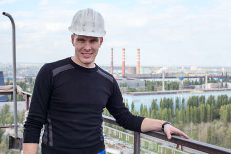 Young handsome man constructor in white hardhat standing on altitude