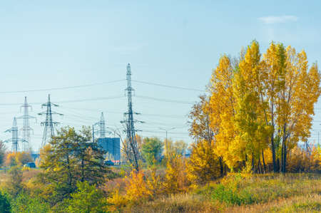 LVIV, UKRAINE - OCTOBER 23, 2019: smoke near factory with cersanit lettering and green trees against sky