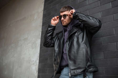 Young handsome successful hipster man in a fashion rock leather jacket and hoodie wears cool round sunglasses near a brick black wall on the street