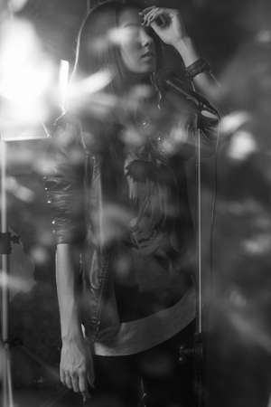 Beautiful female model posing in stylish leather jacket in loft interior. Nightclub party.