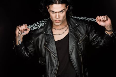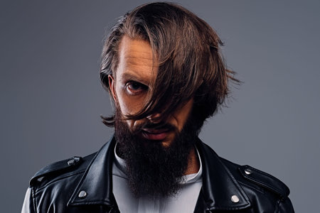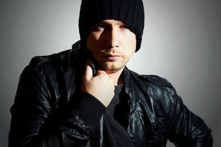close up portrait of a young trendy man in leather black jacket posing to the camera on gray background. fashion, clothes, style concept