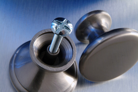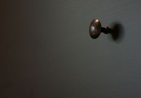 perspective side view closeup of two metallic door knobs on wooden closed black clothes dresser cabinet