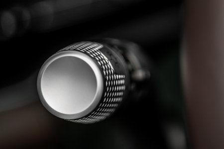 Close up view of a gear lever shift. Manual gearbox. Car interior details. Car transmission. Soft lighting. Abstract view