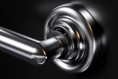 A shiny metallic door handle is seen up close, highlighting its sleek, modern design against a dark surface.