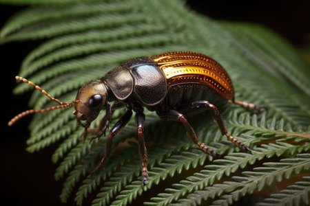 Golden weevil and smaller weevils with black background and green and golden leaves creating a beautiful entomological composition
