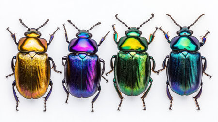 This image features a collection of vibrant beetles showcasing an array of iridescent colors against a clean white background, ideal for studies in nature and entomology.