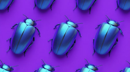 This artistic image features vibrant blue beetles arranged on a striking purple background. Ideal for modern design projects, this photo captures intricate details and textures.