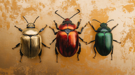 This striking image showcases three colorful metallic beetles against a textured gold background, highlighting the beauty and diversity of insects.