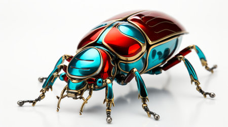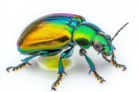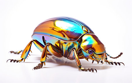 the beetle, showcased against a pristine white background, stands out with its intricate features and vibrant colors, creating a striking contrast that exudes simplicity and elegance, perfect for nature enthusiasts and entomology fans fascinated by insect photography and macro wildlife images. ai generated