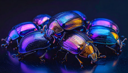 A mesmerizing cluster of iridescent beetles huddles together, their metallic shells shimmering with a futuristic palette of electric blue, vibrant purple, and warm gold. Bathed in a mysterious neon glow against a dark backdrop, this macro view reveals the intricate and otherworldly beauty of the insect world.