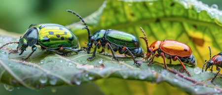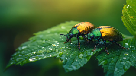 A pair of beetles on a dew-drenched leaf, their shiny bodies reflecting the morning light, surrounded by lush greenery, creating a natural and dynamic scene.