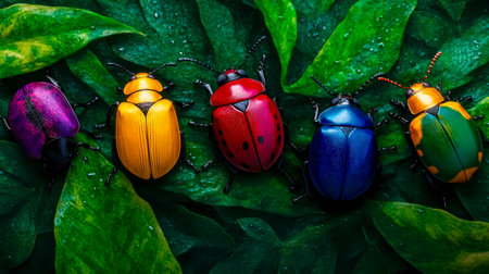 Explore a vibrant close-up of colorful insects on a lush green leaf, adorned with water droplets, showcasing the beauty of nature and biodiversity.