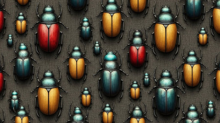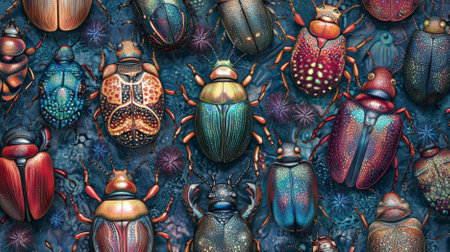 A mesmerizing pattern featuring colorful beetles against a vibrant background, perfect for art, design, and nature themes in any creative project.