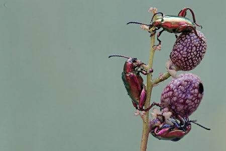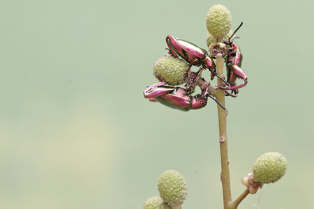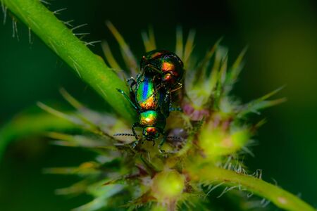 Selective focus Macro image of two jewel bugs with vibrant colors walking on a stem with blur green background