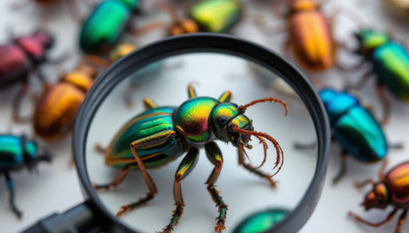 Magnified view of a vibrant beetle surrounded by colorful insects