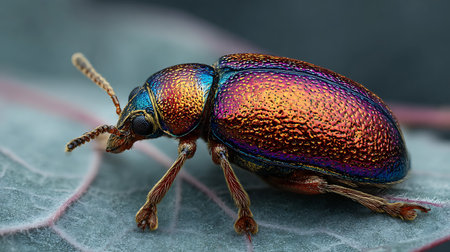 A colorful beetle exploring the textured surface of a leaf, adding a pop of nature's palette to the scene.