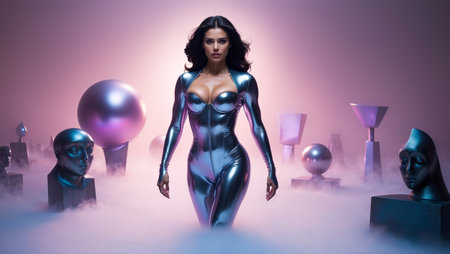 Woman wearing a shiny silver bodysuit is walking in a vaporwave landscape with statues and geometric shapes