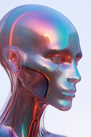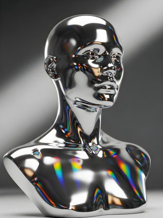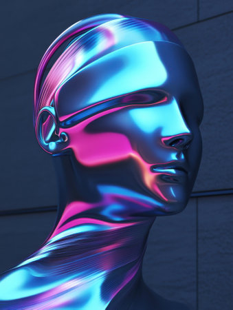 Iridescent holographic bust reflecting a spectrum of vibrant colors in a futuristic abstract display