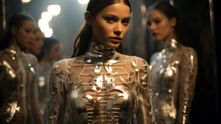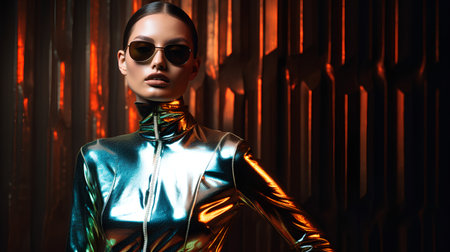 Fashion shot of a beautiful woman in a shiny metallic suit.