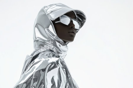 A fashion model poses confidently, highlighting a striking silver jacket with a hood. The reflective sunglasses add an edgy touch, creating a contemporary and stylish look in a clean environment.