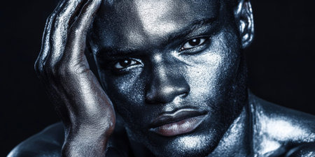 Intense close-up portrait of a man featuring shimmering skin, set against a dark background, highlighting beauty and emotion through light and shadow.