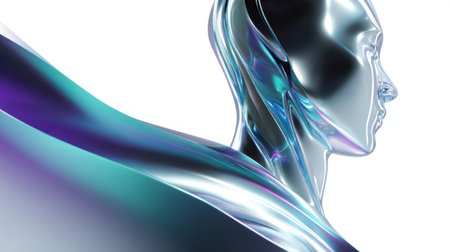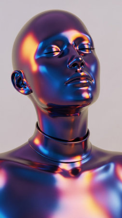 Futuristic metallic humanoid robot with iridescent design against abstract background.