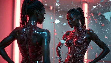Futuristic woman admiring her reflection in a shattered mirror
