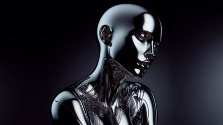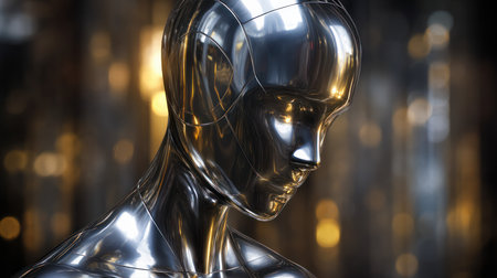 Close-up of a sleek, modern humanoid robot with metallic surface reflecting light, futuristic design. Artificial Intelligence, Futuristic Digital Technology, Metaverse of Digital Intelligent World.