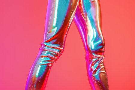 A woman in shiny pants is walking on a red background. The pants are metallic and shiny, giving the impression of futuristic fashion