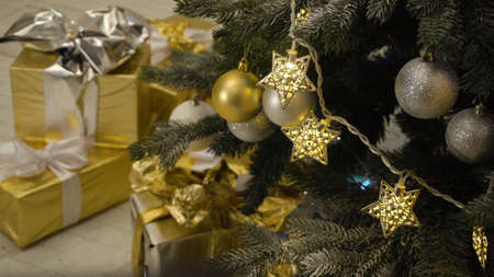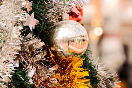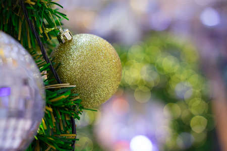 Golden & Silver color of christmas ball on the branches fir with beautiful light bokeh, Decorated Christmas tree. New Year Decoration festive background with vintage tone and selective focus.