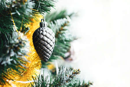 Silver gray toy cone hanging on Christmas tree with golden yellow tinsel garland on white background. Holiday banner with copy space. Selective focus