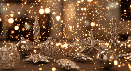 This captivating image features a blend of elegant holiday decorations, including glittering ornaments and natural pine cones, creating a festive atmosphere.