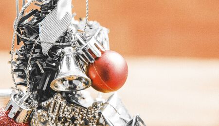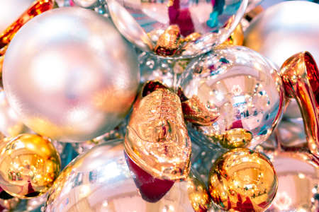 Shiny balloons and colorful tinsel elements of Christmas tree decoration, Close-up, selective focus. New year and christmas