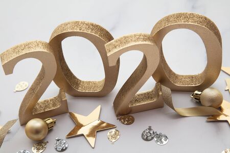 2020 New year golden number with sparkling festive christmas lights bokeh and tree branch, red background, Christmas decorations.