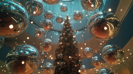 A beautiful Christmas tree stands tall in a decorated lobby, surrounded by shiny ornaments and glowing lights, creating a festive and joyful atmosphere for the holiday season.