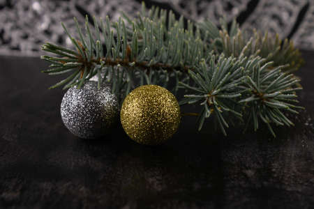 New Year composition with silver balls and silver fir tree branches. Part of the frame.