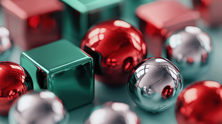 Abstract 3D composition featuring red pyramid, silver sphere, and green geometric shapes with reflections for Christmas.