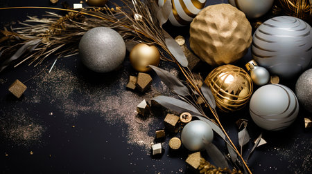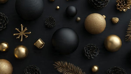 An exquisite collection of gold and black Christmas ornaments perfectly arranged, showcasing intricate designs and textures for a stunning holiday display or promotional use.