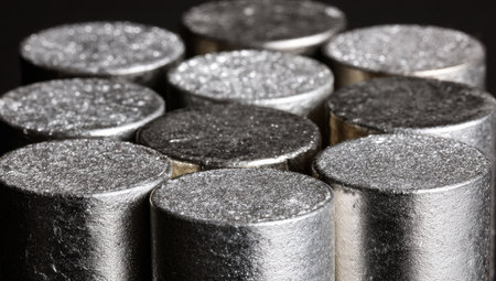 This image showcases a collection of metallic cylindrical objects arranged closely together. The objects exhibit a silver-grey color with textured surfaces, suggesting a metallic composition. The lighting appears to be focused, creating highlights and shadows, accentuating the three-dimensional form. This visual would be suitable for various commercial or scientific applications.