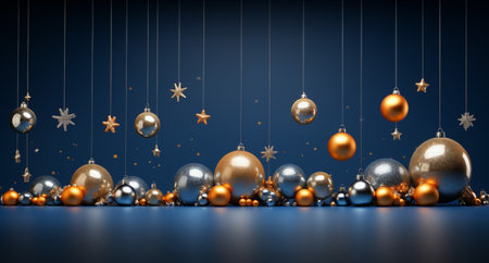 A vibrant composition featuring geometric shapes and decorative elements in gold and silver tones against a striking blue backdrop, perfect for festive visuals.