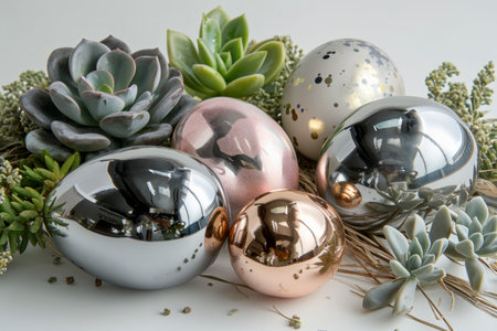 An AI generated illustration of metallic Easter eggs in silver and gold hues positioned alongside a collection of vibrant succulents