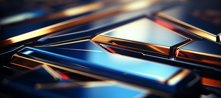 high-tech background with geometric glazed metalic figures of various shapes with blue, white, gold colors