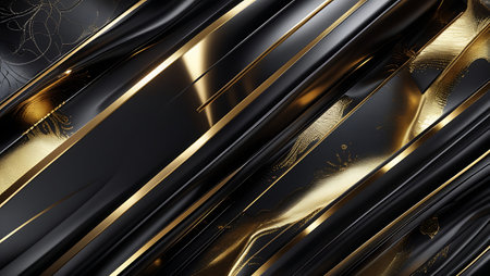 A luxurious and sophisticated abstract background featuring dynamic diagonal lines in black and gold. The design combines smooth, glossy surfaces with intricate gold patterns, creating a sense of elegance and opulence. Perfect for modern design projects that require a premium touch.
