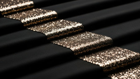 This image showcases a close-up view of a luxurious black fabric adorned with golden sparkles. The fabric appears to be soft and smooth, with the sparkles adding a touch of glamour and elegance. The contrast between the deep black and the shimmering gold creates a striking visual effect, perfect for high-end fashion or decorative purposes.