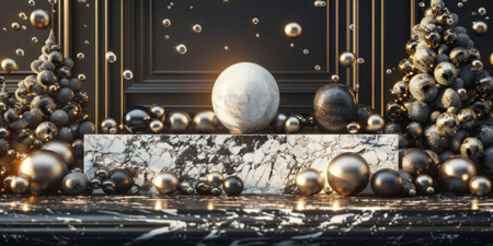 Metallic shapes in gold and silver are artistically arranged on a sleek black marble surface. The composition features spheres and cubes showcasing a blend of elegance and modern design.