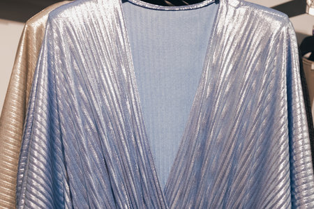 Elegant blue dress features pleats and a deep V-neckline, showcasing luxurious fabric texture, ideal for evening events or special occasions, enhancing contemporary style